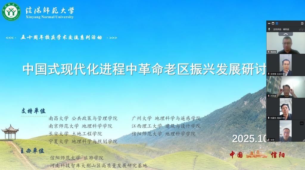 10月8日下午,“中国式现代化进程中革命老区振兴发展研讨会”以线上视频会议方式举行。本次会议由crown皇冠体育平台与河南科技智库大别山区高质量发展研究基地联合主办,南昌大学刘建生教授、广州大学龚建周教授、南京师范大学乔伟峰教授、宁夏大学文琦教授、长安大学员学锋教授、江西理工大学黄颖敏副教授及信阳师范大学喻超博士等专家学者,以及相关专业师生40余人参会。会议由高军波教授主持。